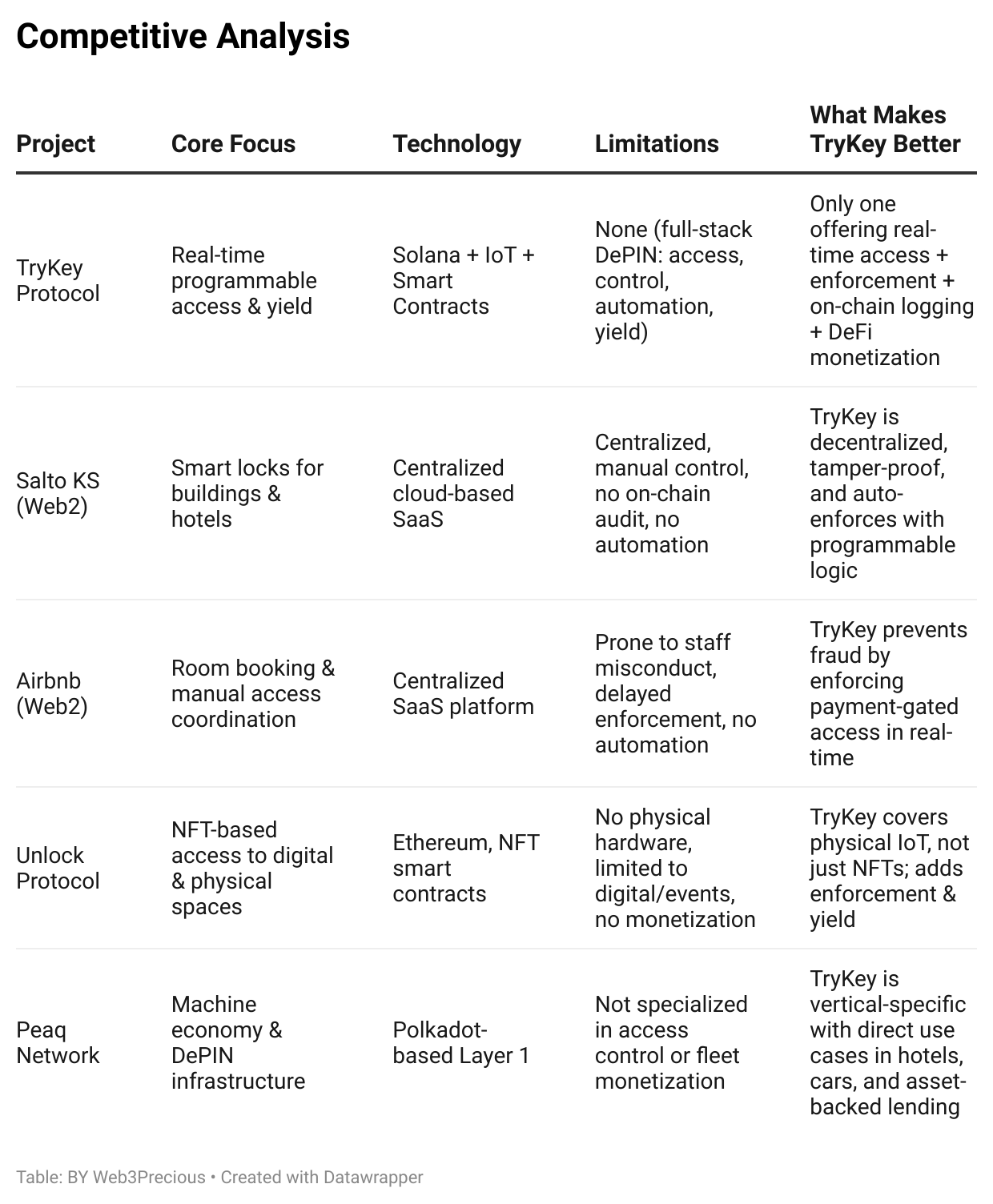 By introducing Access-as-a-Token, TryKey doesn't just improve asset management — it reinvents it, enabling a future where hotels, vehicles, and commercial spaces can be managed trustlessly, transparently, and in real time.